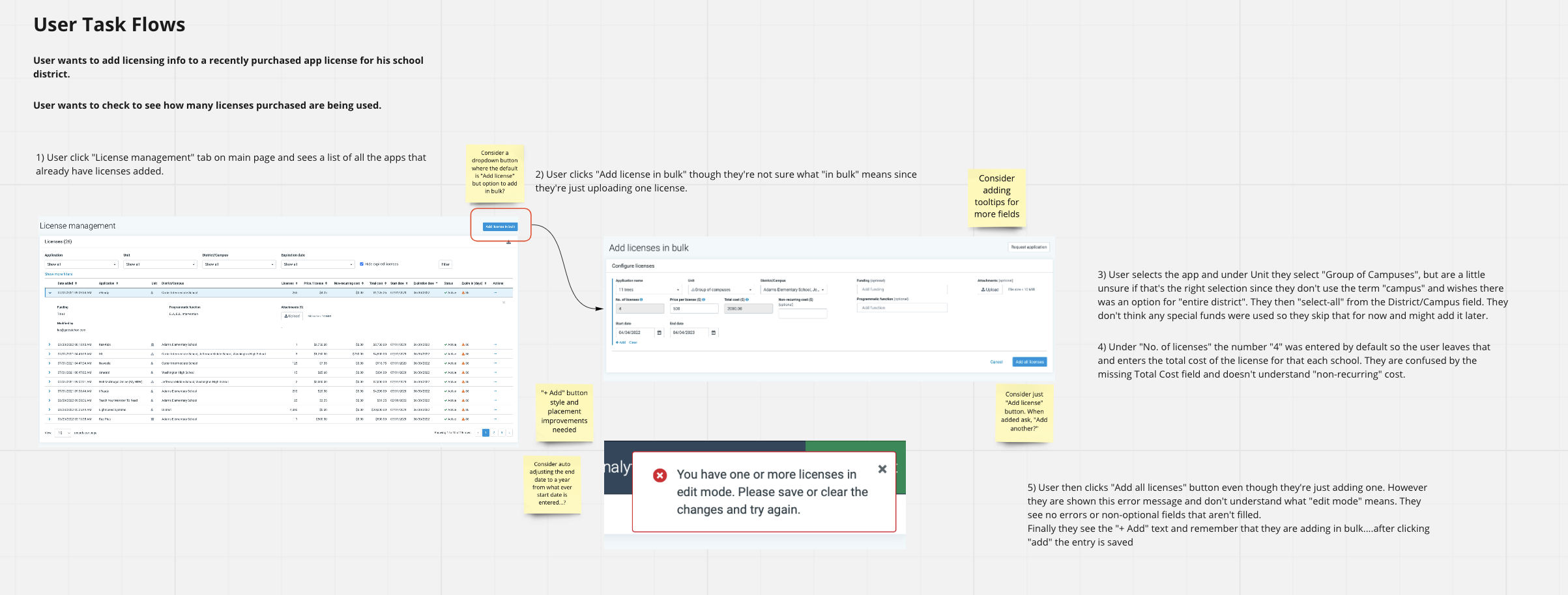 In order to understand the problem from the customer point of view, we sat in on Customer Success calls where we witnessed user’s confusion as they fumbled through a very complicated flow. Using a test account, I then attempted to add licenses to application and view usage insights as if I was a customer. I took detailed notes and kept track of possible solutions along the way.